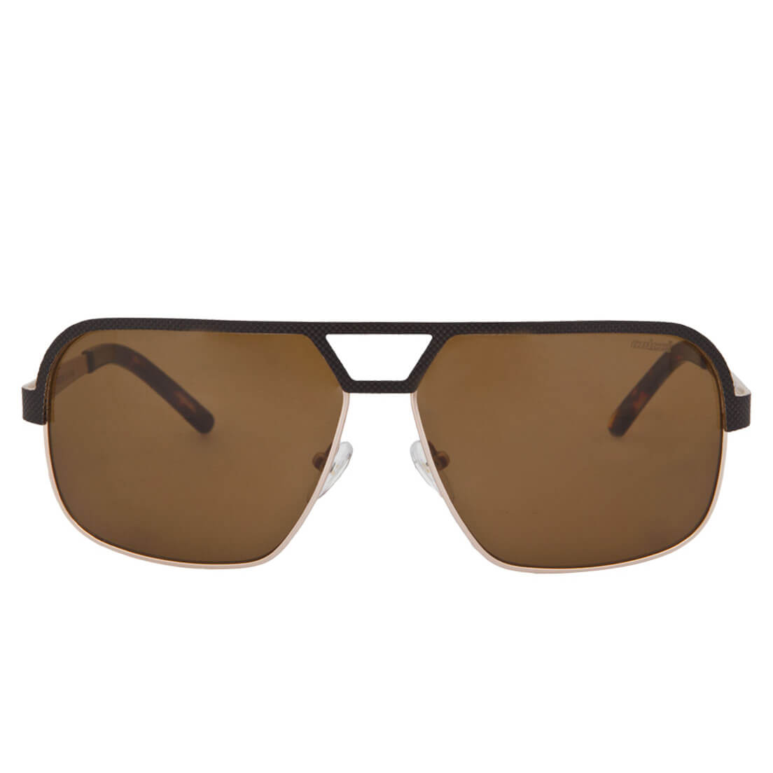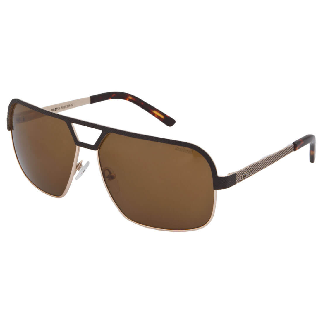 ÓCULOS DE SOL COLCCI MASCULINO, COM HASTE DE METAL DOURADO E PRETO, COM LENTES MARROM DEGRADÊ.
