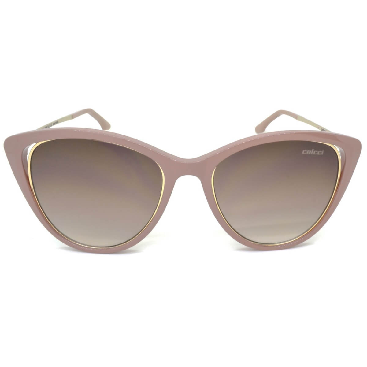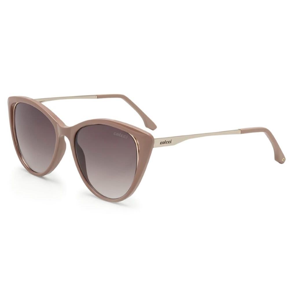 ÓCULOS DE SOL FEMININO COLCCI, COM HASTE DE ACETATO E METAL NAS CORES NUDE E PRATA, E LENTES MARROM DEGRADÊ.