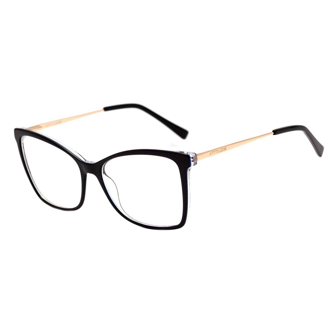 Óculos de grau Atitude feminino, com haste de metal e acetato, nas cores dourado e preto, com detalhes transparentes.