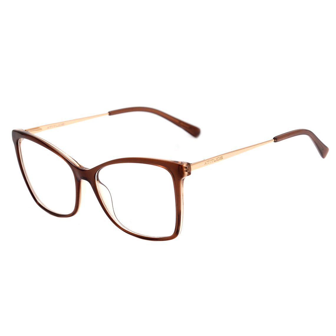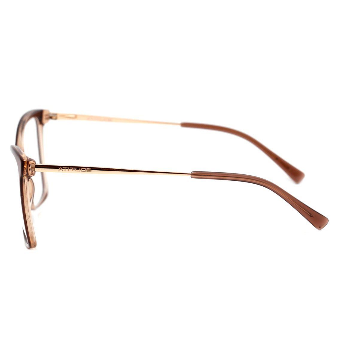 ÓCULOS DE GRAU FEMININO ATITUDE, COM HASTE DE METAL E ACETATO COR MARROM TRANSLÚCIDO E DOURADO.