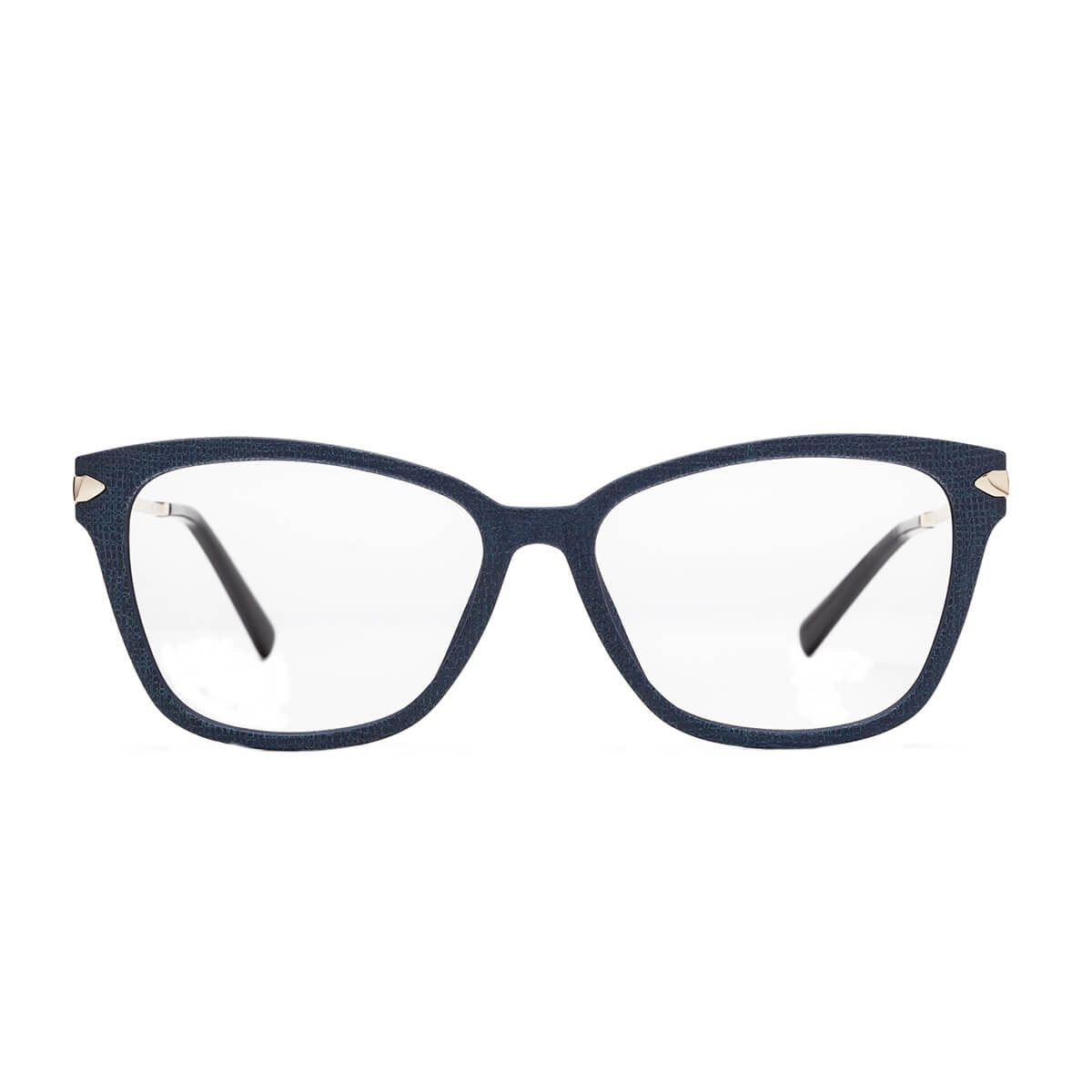 ARMAÇÃO PARA ÓCULOS DE GRAU FEMININO, COM HASTE DE METAL E ACETATO NA COR AZUL JEANS, DOURADO E PRETO.