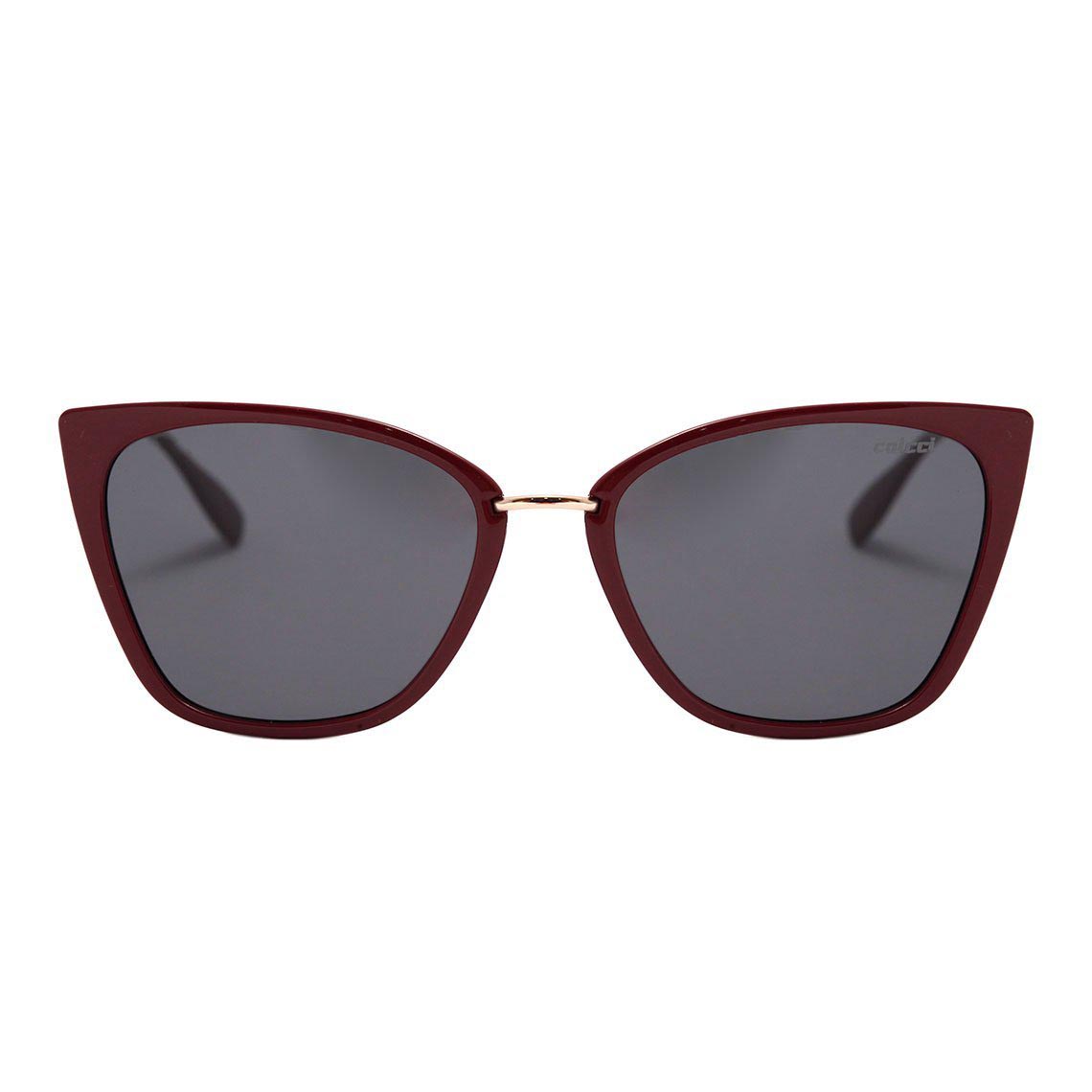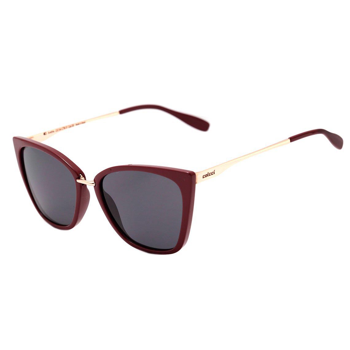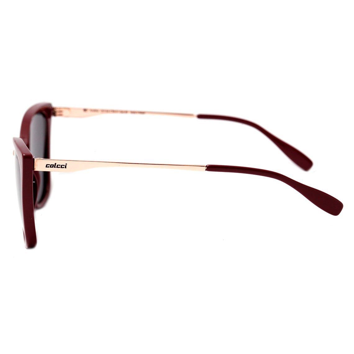 ÓCULOS DE SOL FEMININO COLCCI, COM HASTE DE ACETATO E METAL NAS CORES BORDÔ E BRONZE E COM LENTES CINZAS.