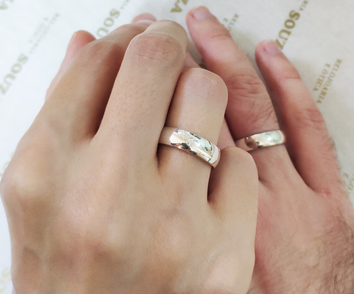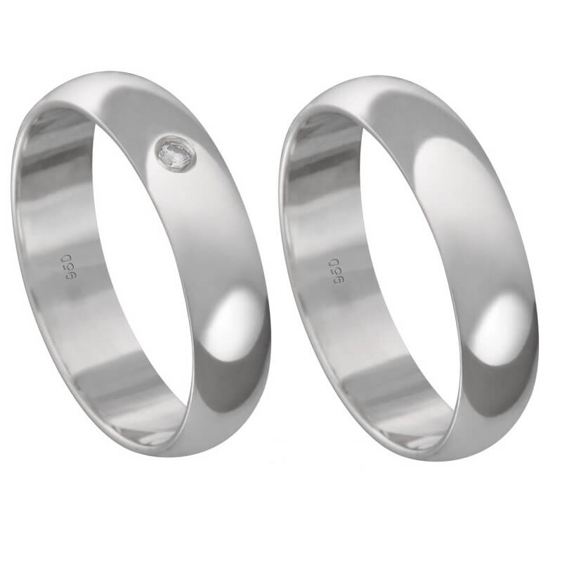 Par de aliança de prata 950 tradicional de 5mm de largura, com uma zircônia no modelo feminino