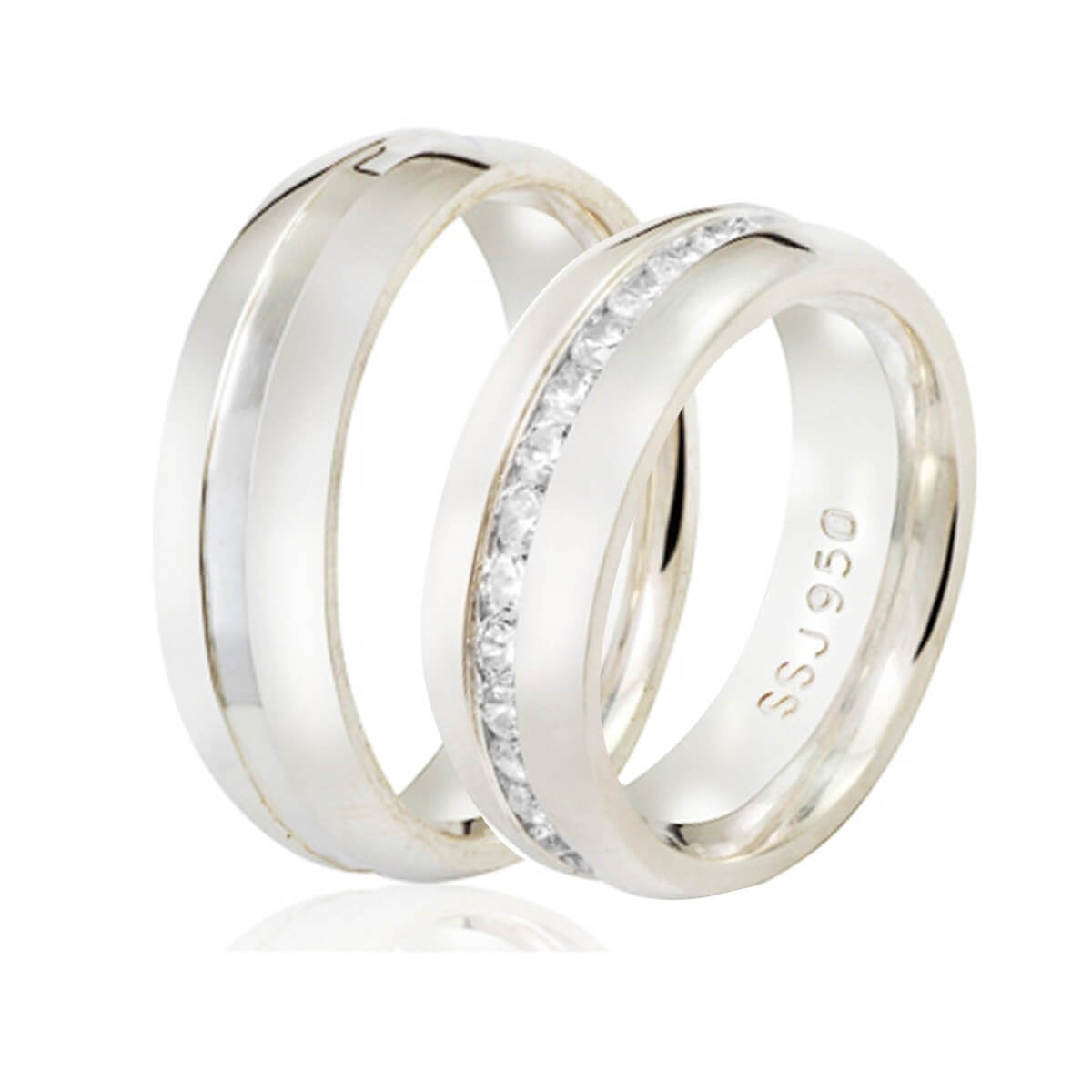 Par de aliança de prata 950 de 5mm de largura, com o modelo feminino rodeado de zircônias e o masculino com friso