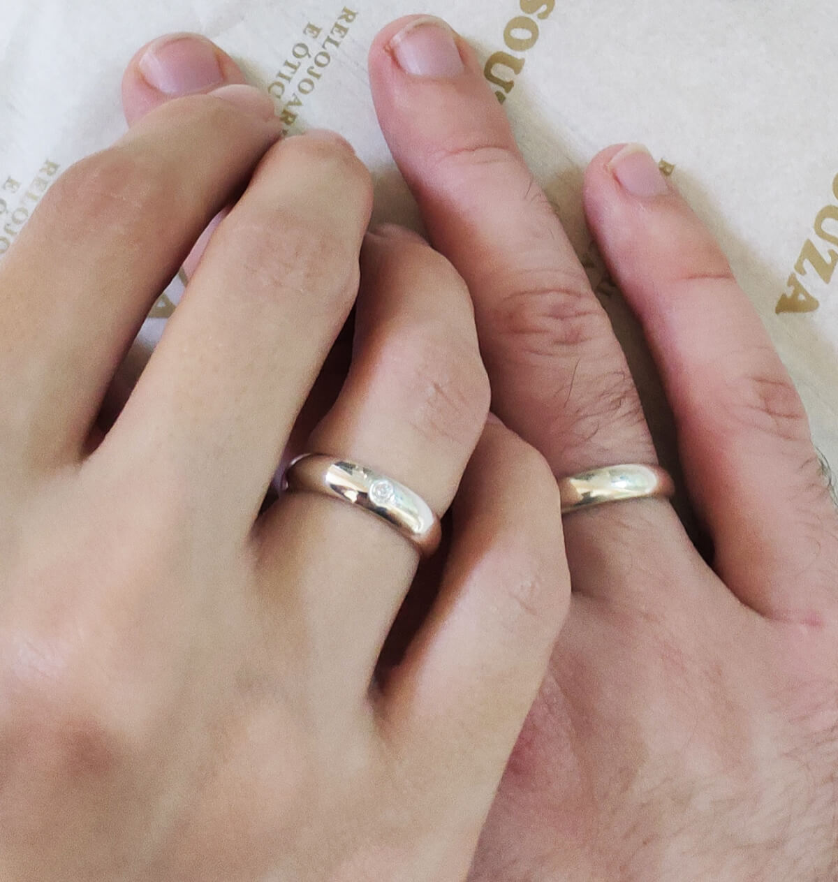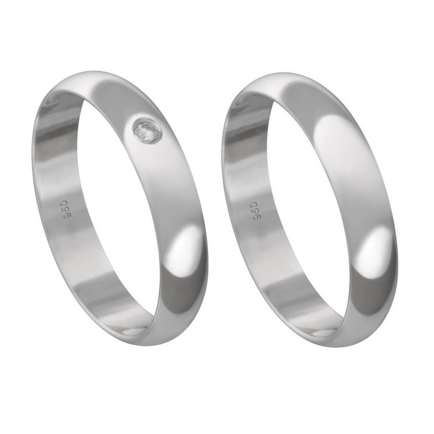 Par de aliança de prata 950 tradicional, de 3,8mm de largura o modelo feminino e 4,5mm de largura o modelo masculino, com uma zircônia no modelo feminino.