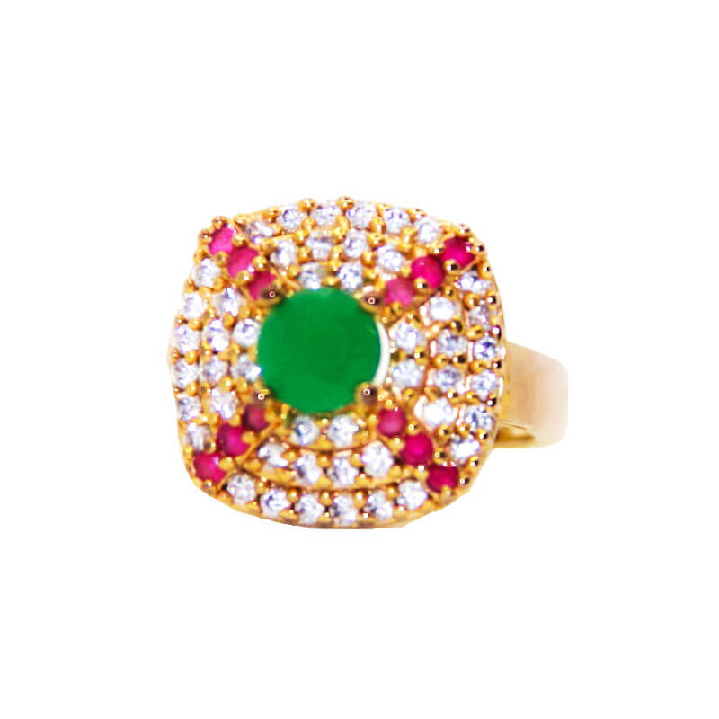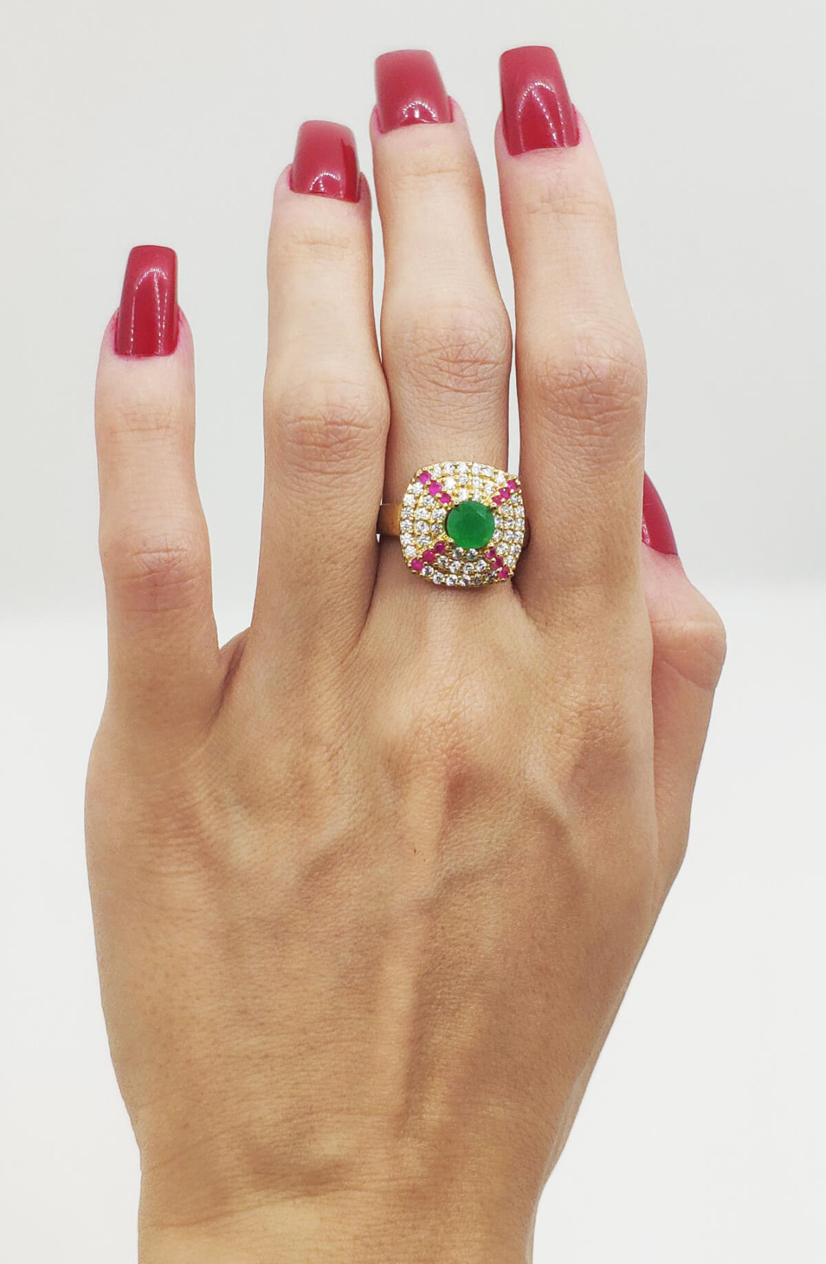 Lindo anel Folheado a ouro 18k, com pedras de zircônia branca e vermelha e uma pedra esmeralda sintética.