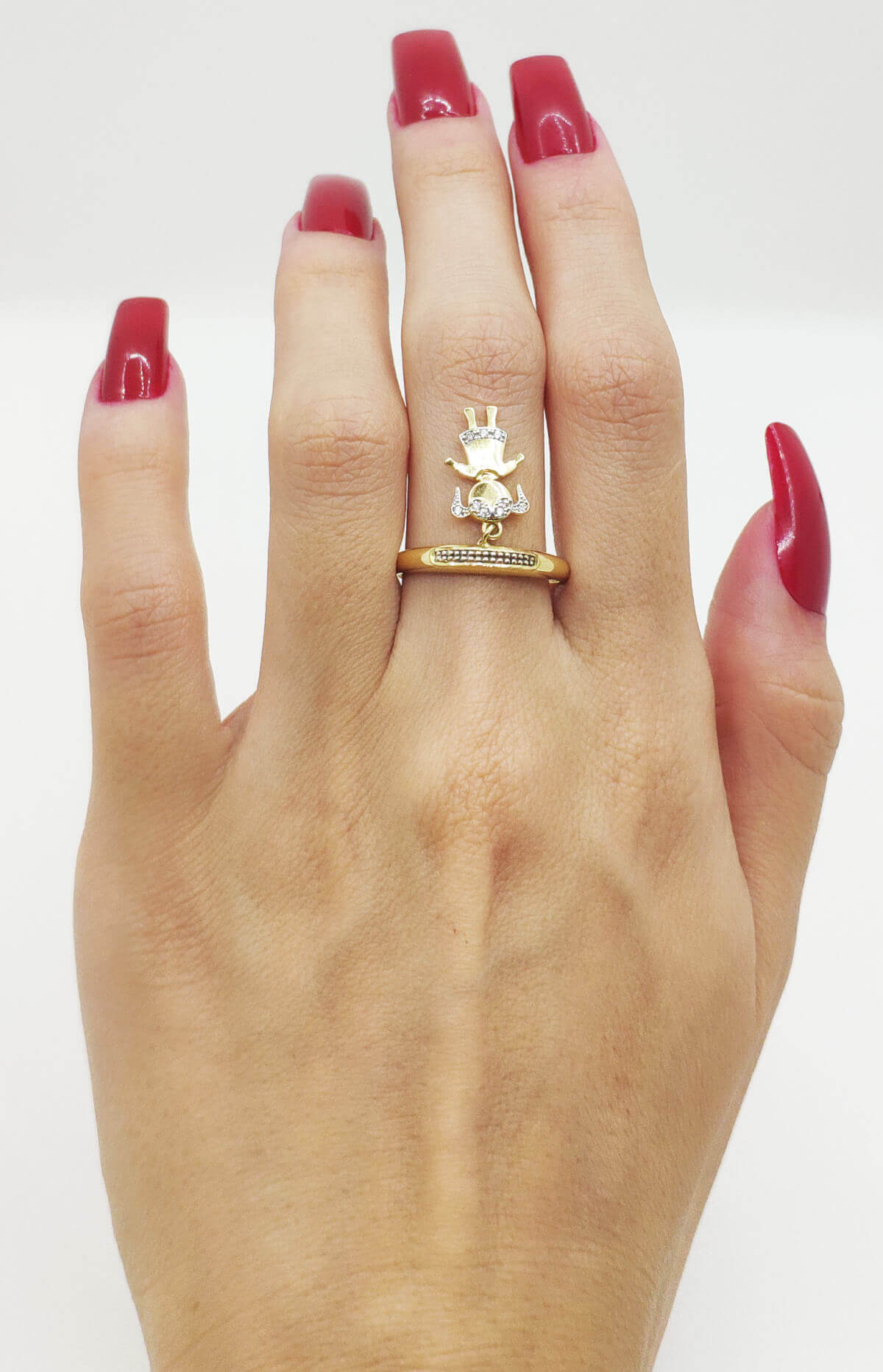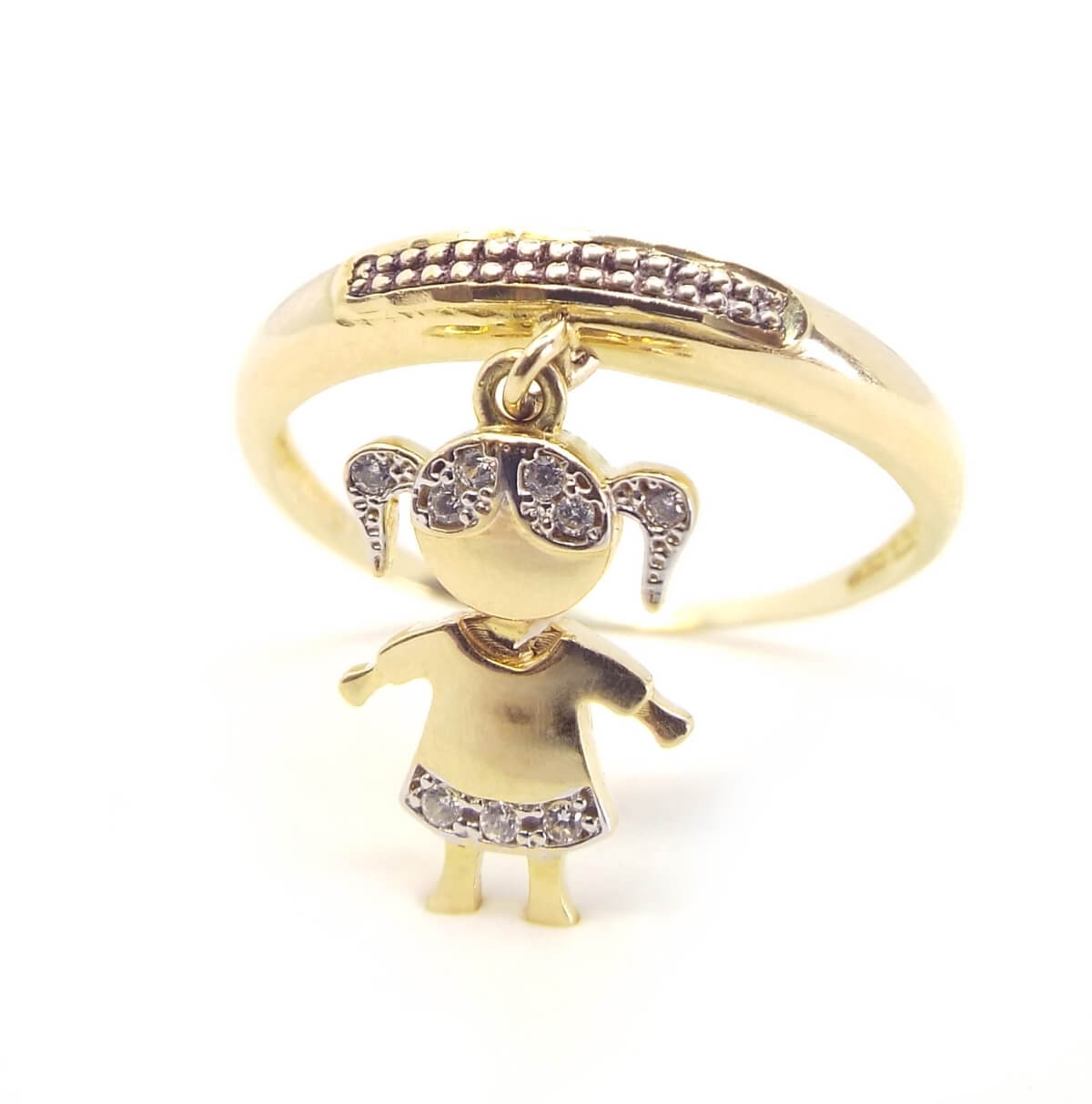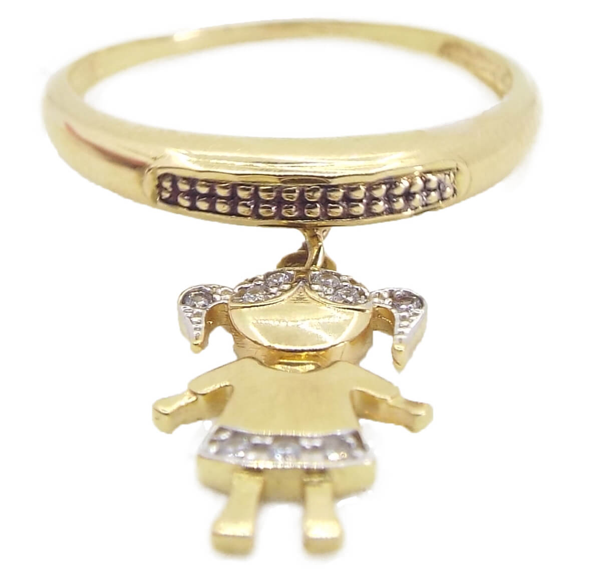 Belíssimo anel de ouro 18k com boneco de menina com detalhes de zircônia.