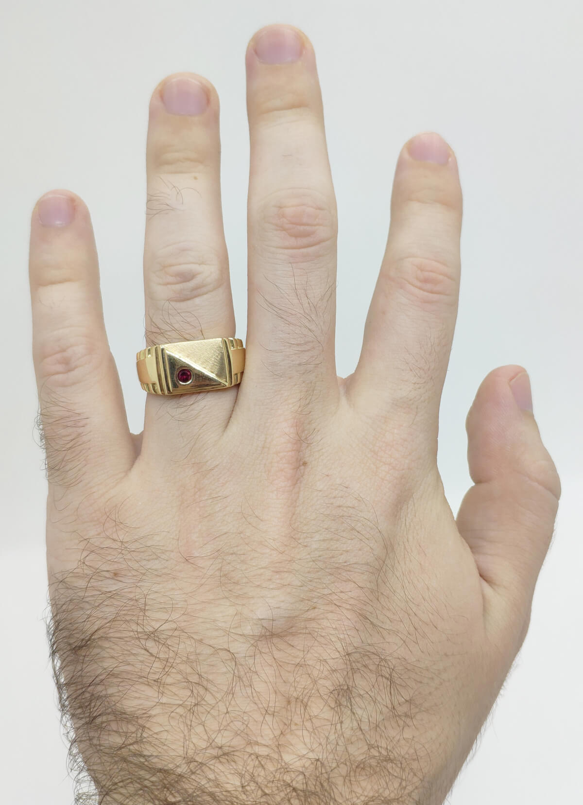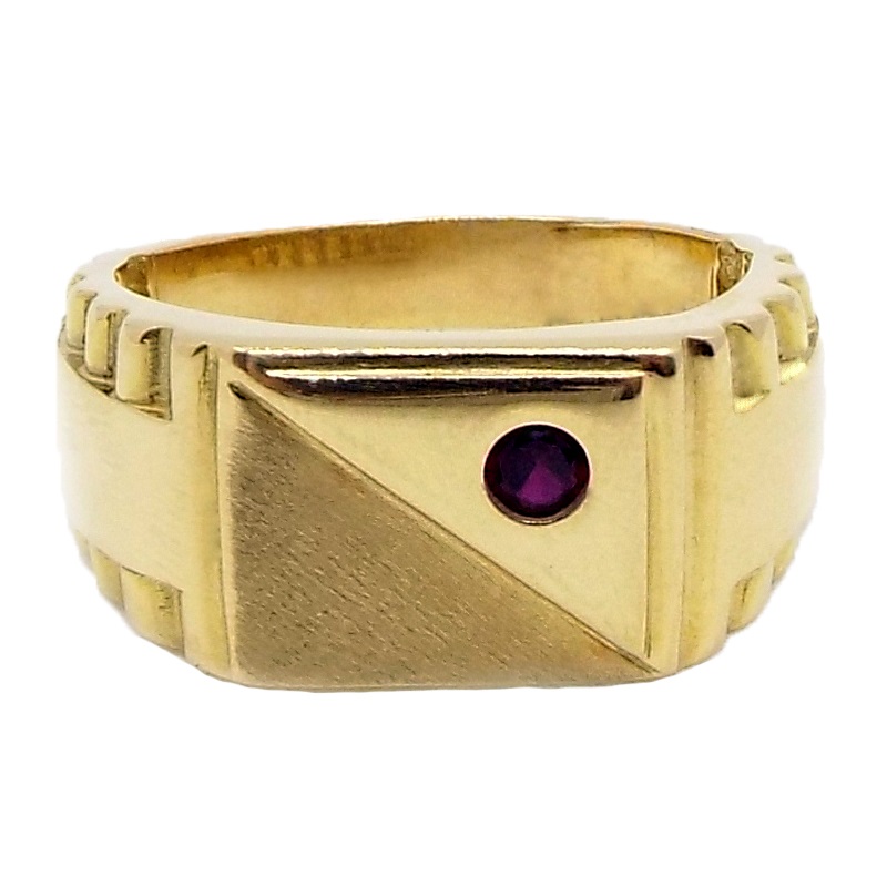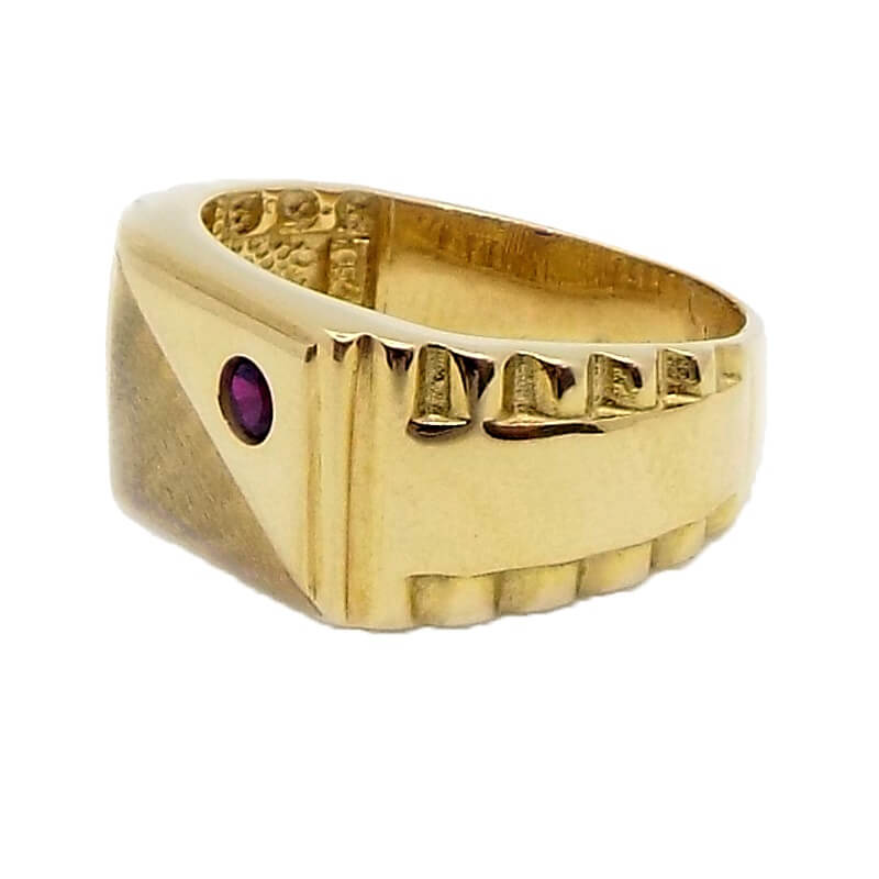 Estiloso anel de ouro trabalhado com pedra de ruby
