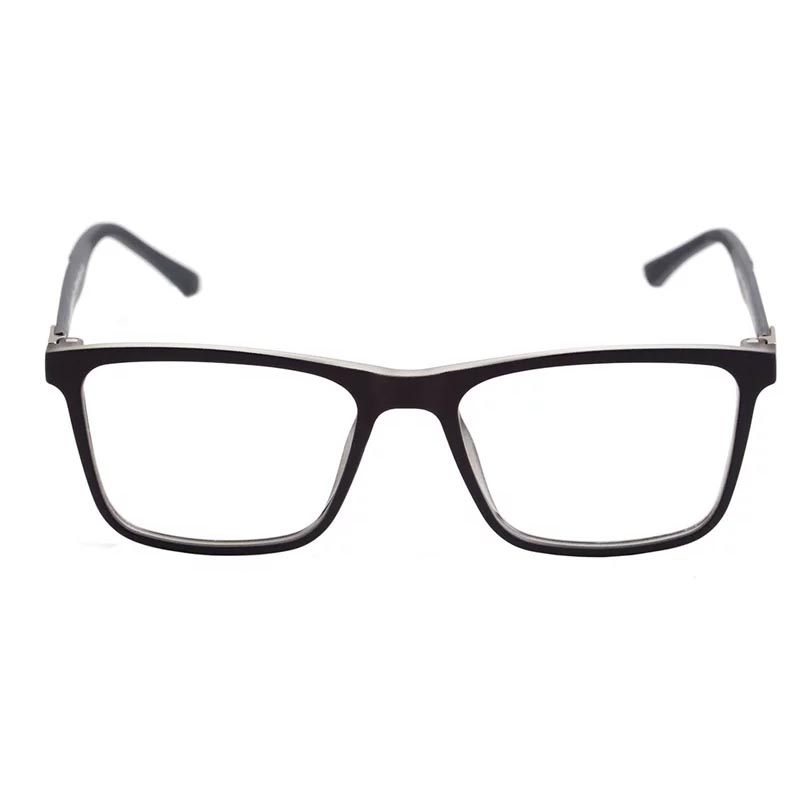 ARMAÇÃO DE ÓCULOS DE GRAU MASCULINO, COM HASTE DE ACETATO NAS CORES CINZA TRANSLÚCIDO E PRETO.