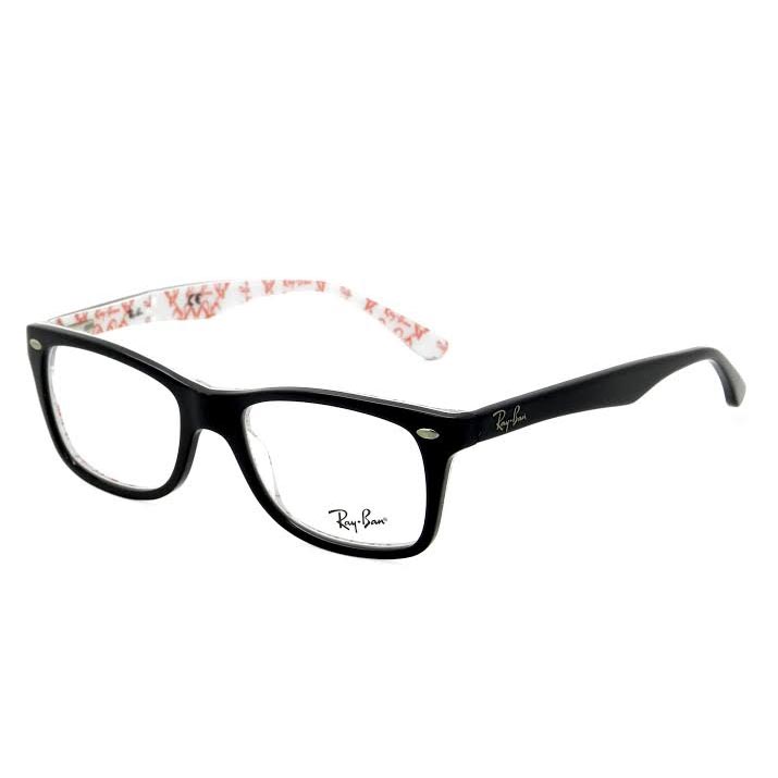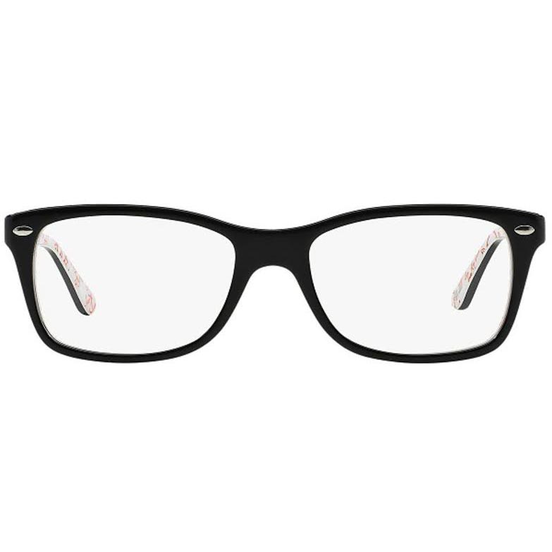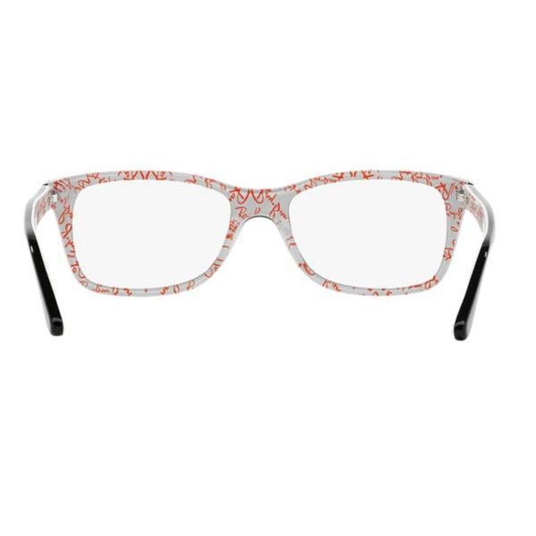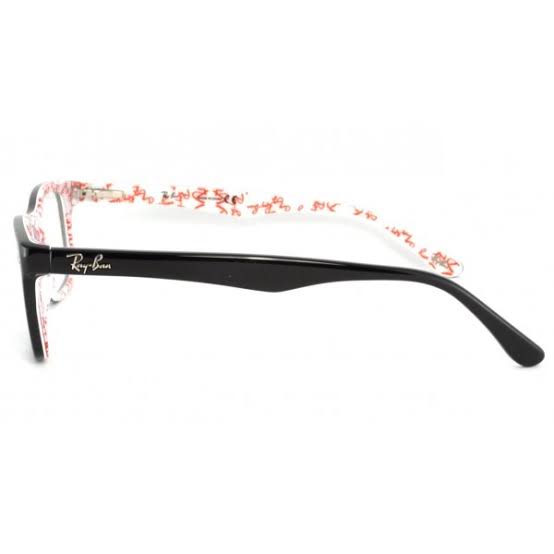 ARMAÇÃO DE ÓCULOS DE GRAU UNISSEX RAY-BAN, COM HASTE DE ACETATO NAS CORES PRETO E BRANCO COM ESCRITAS DA LOGO EM VERMELHO.