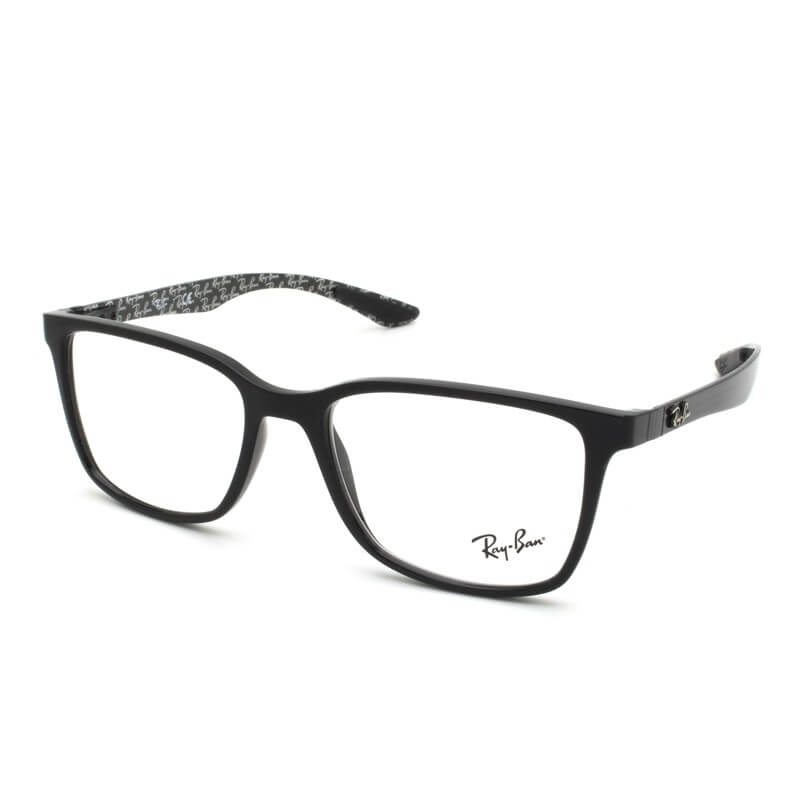 ARMAÇÃO PARA ÓCULOS DE GRAU MASCULINO RAY-BAN, COM HASTE DE ACETATO PRETA COM LOGOS RAY-BAN BRANCAS.