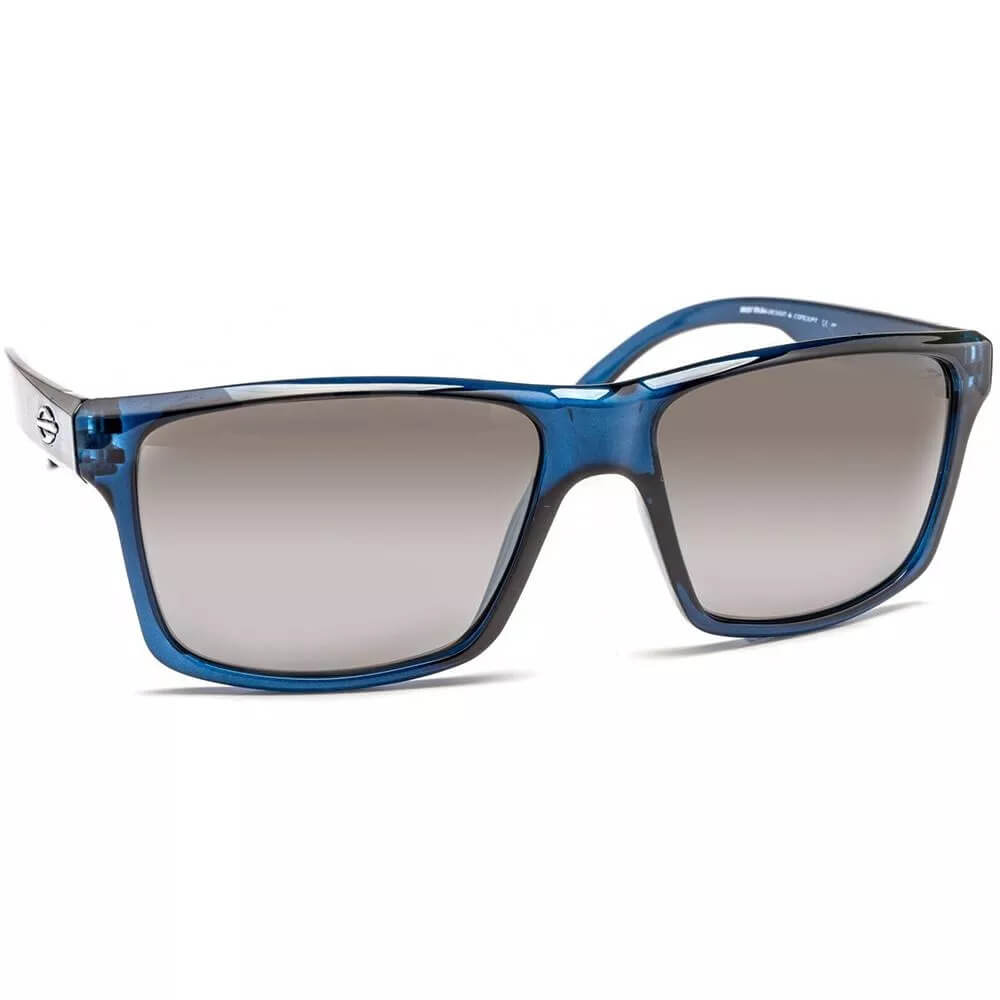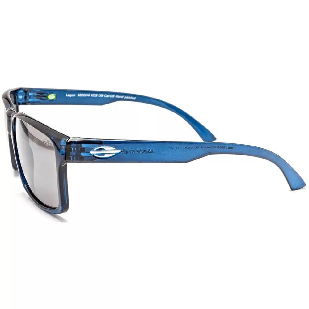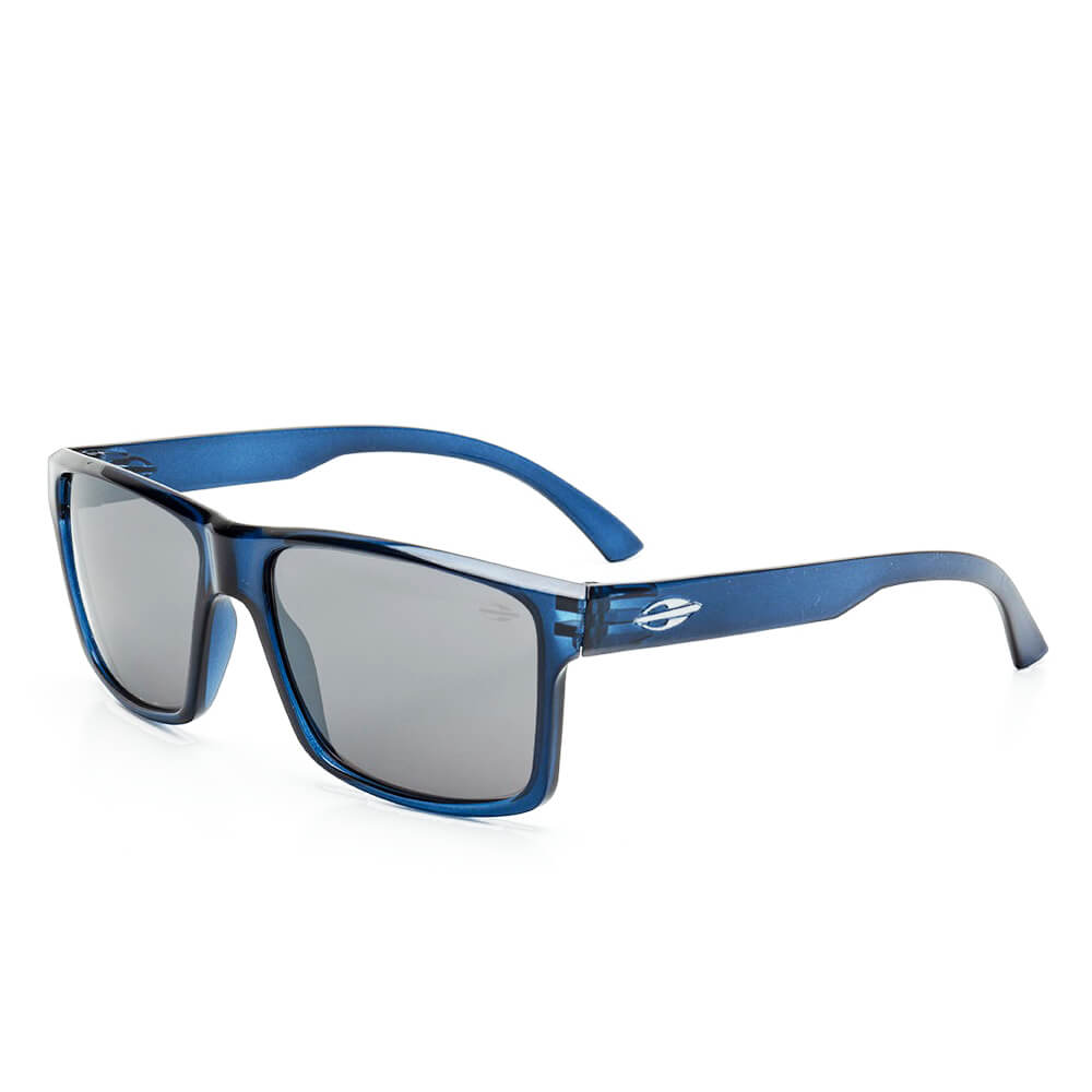 ÓCULOS DE SOL MASCULINO MORMAII, COM HASTE DE ACETATO COR AZUL TRANSLÚCIDO E LENTES CINZA.