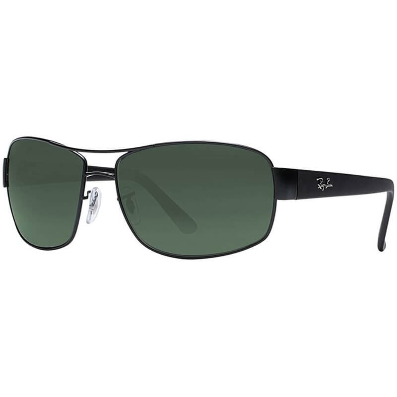 Óculos de sol Ray-ban unissex, com haste de acetato e metal nas cores preto e dourado e lentes verdes.