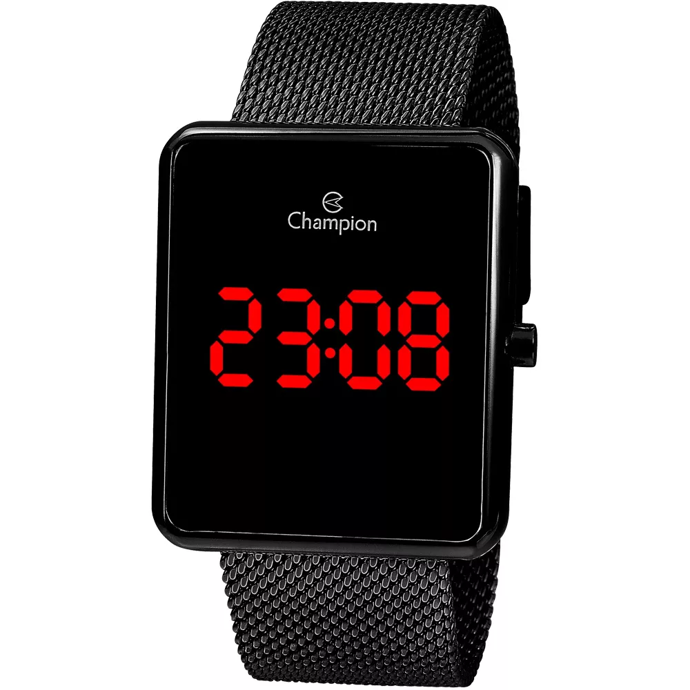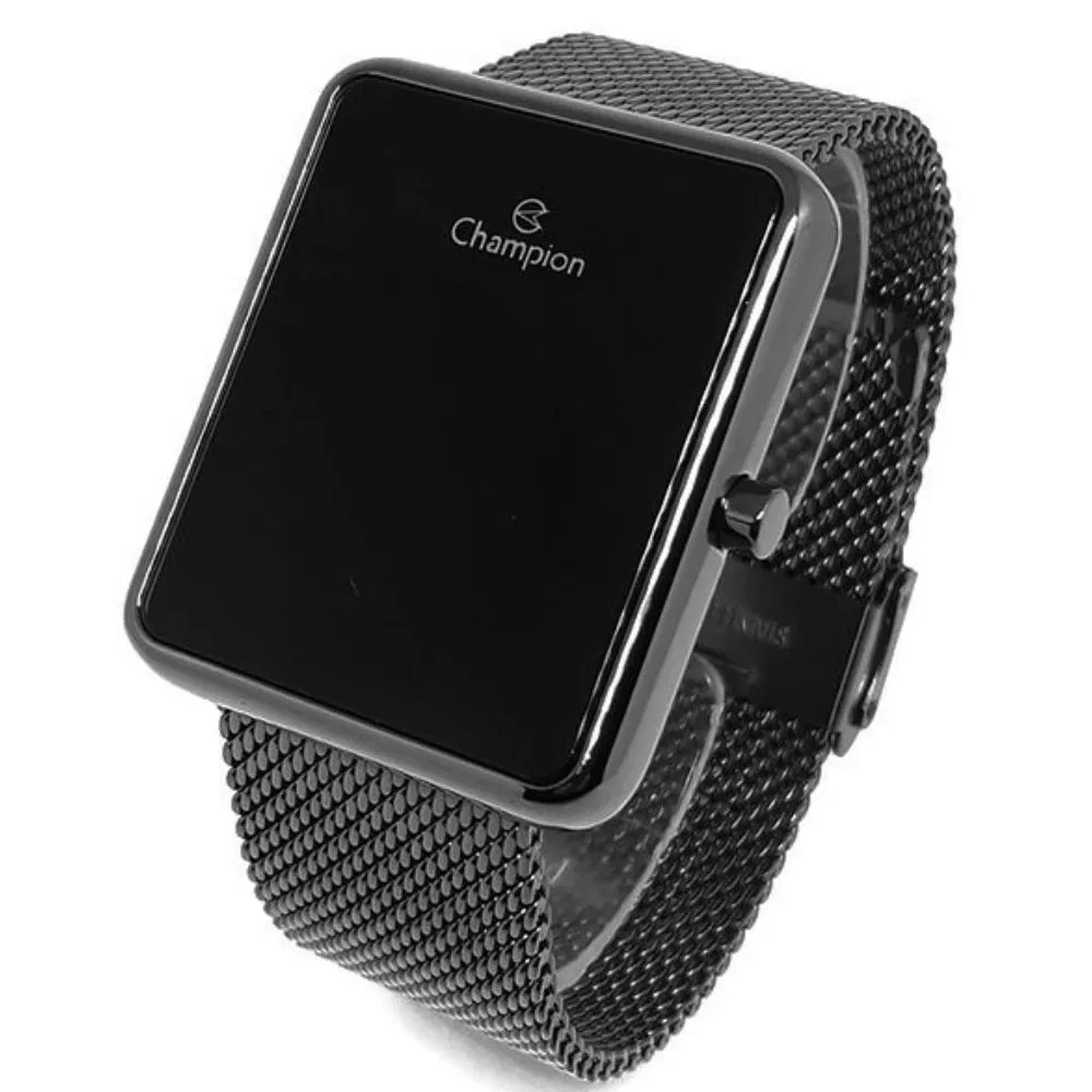 RELÓGIO CHAMPION FEMININO DIGITAL LED, COM PULSEIRA DE METAL TIPO ESTEIRA NA COR PRETA, COM CAIXA PRETA E COM MOSTRADOR PRETO. O MOSTRADOR APRESENTA O HORÁRIO AO PRESSIONAR O BOTÃO LATERAL.