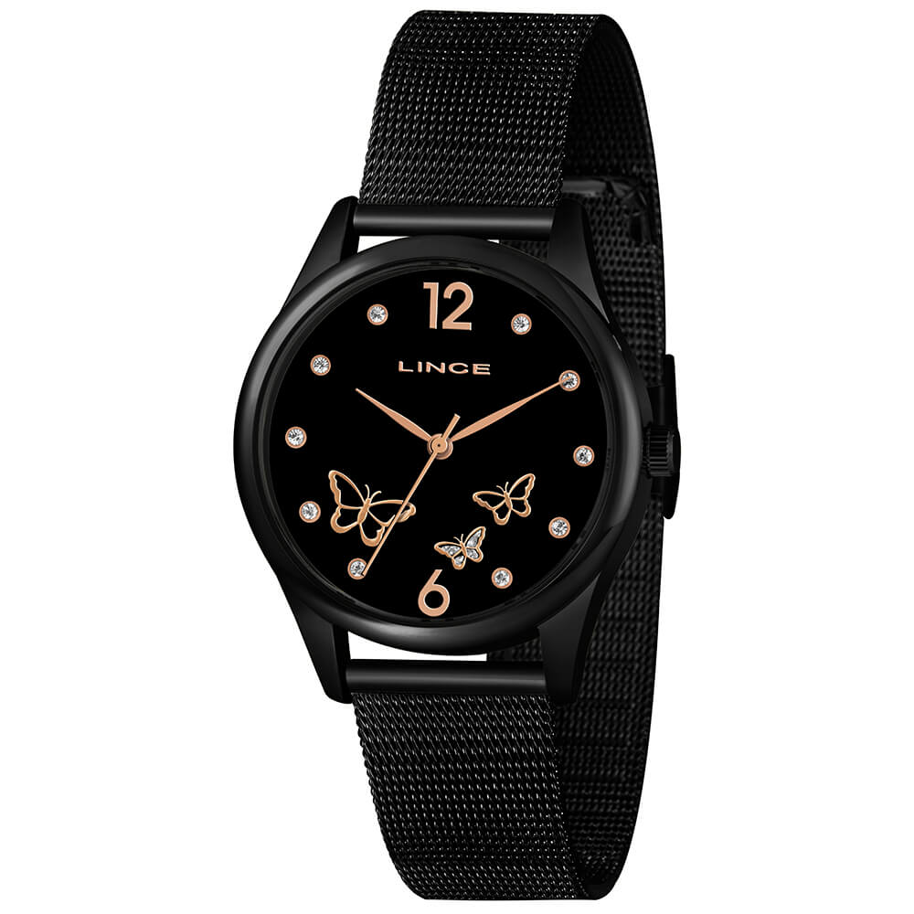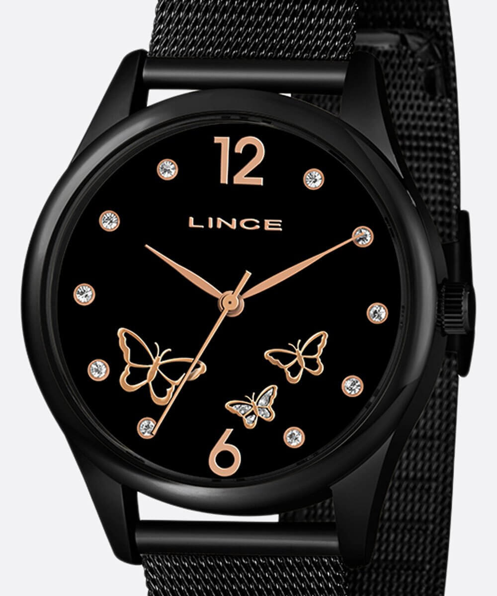 RELÓGIO ANALÓGICO LINCE FEMININO lrnj105L p2px PRETO COM DETALHES EM ROSÉ E PULSEIRA DE ESTEIRA