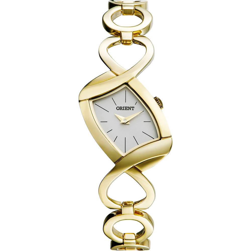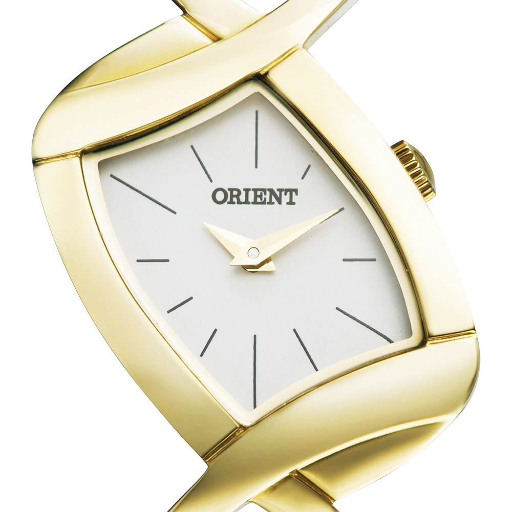 RELÓGIO ORIENT FEMININO ANALÓGICO, COM PULSEIRA DE ELOS DOURADOS, COM MOSTRADOR DE FUNDO BRANCO.