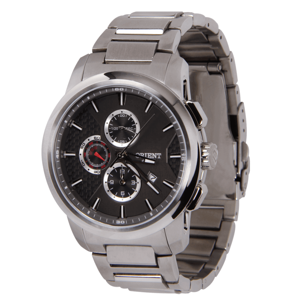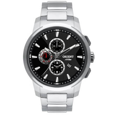 RELÓGIO ORIENT MASCULINO ANALÓGICO, COM PULSEIRA DE METAL, COM MOSTRADOR FUNDO PRETO, COM CALENDÁRIO E CRONÓGRAFO.