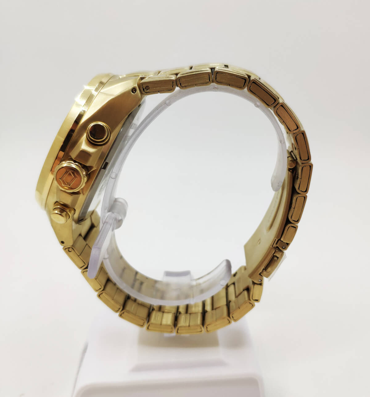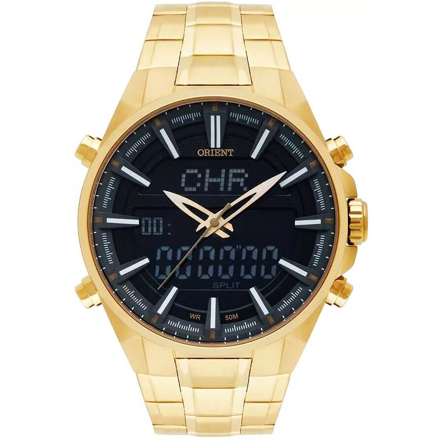 RELÓGIO ORIENT MASCULINO ANALÓGICO E DIGITAL, COM PULSEIRA DE METAL DOURADA, COM MOSTRADOR DE FUNDO PRETO COM DETALHES EM BRANCO.
