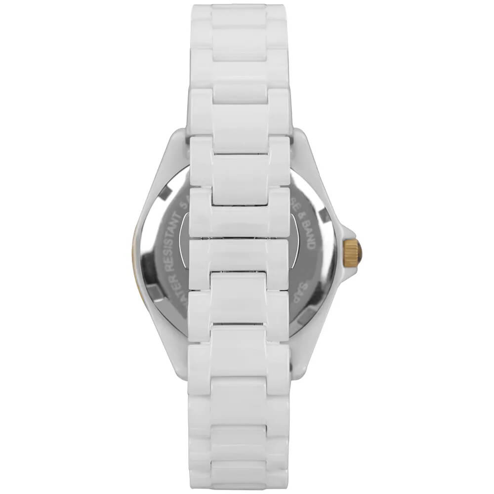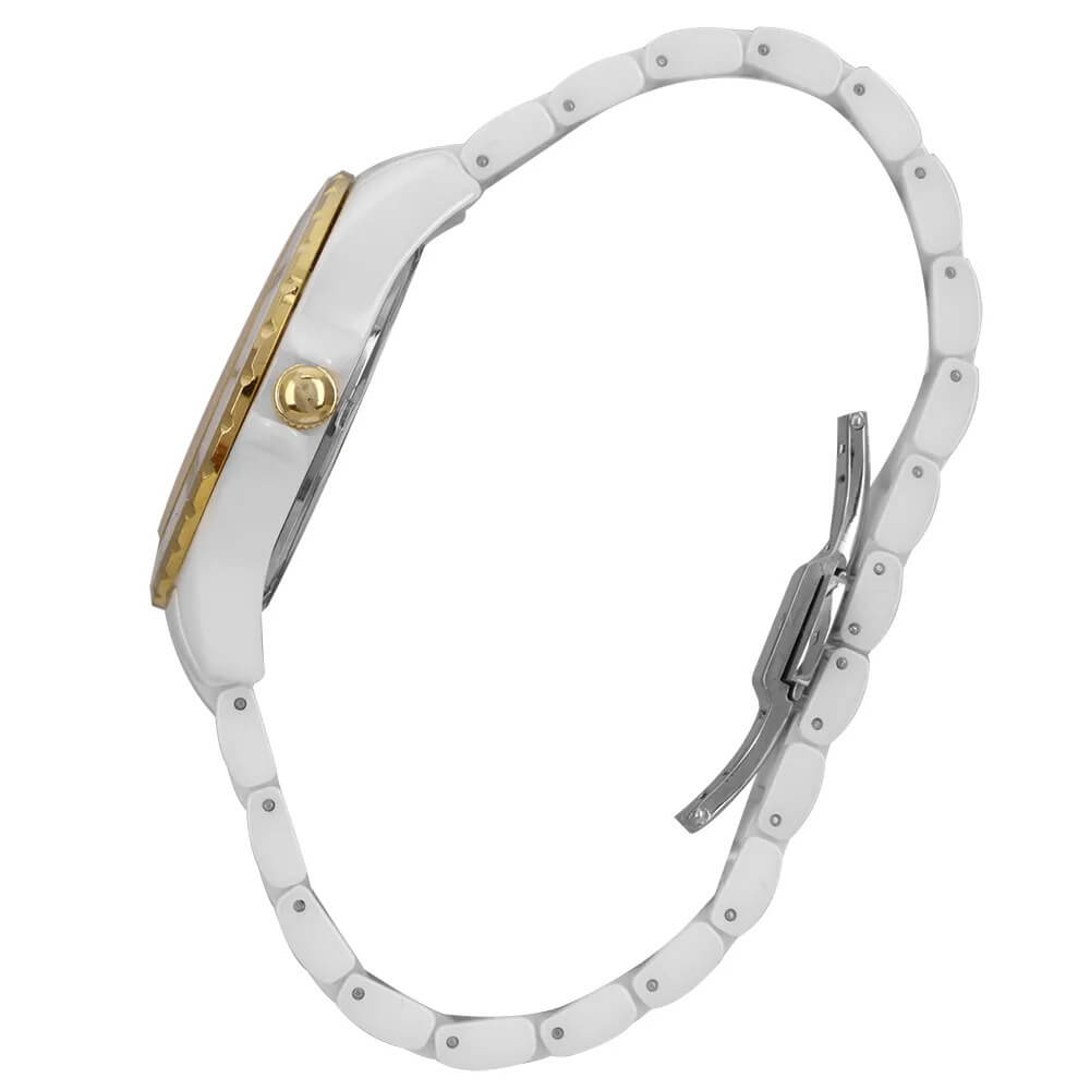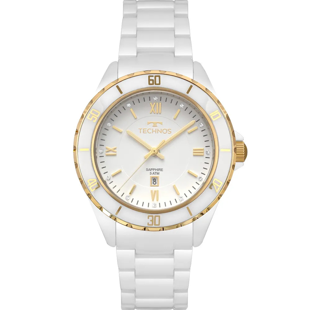 RELÓGIO TECHNOS FEMININO ANALÓGICO, COM PULSEIRA DE CERÂMICA BRANCA, COM MOSTRADOR FUNDO BRANCO COM DETALHES DOURADOS.