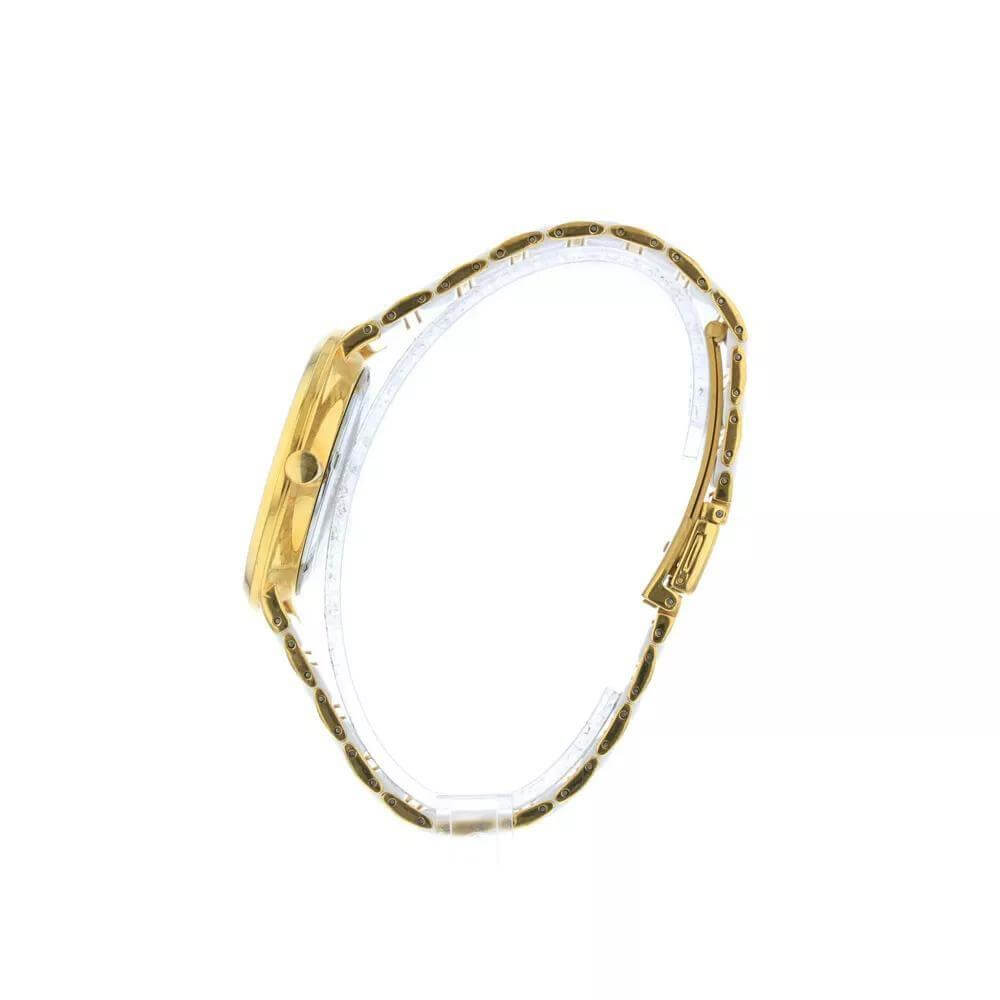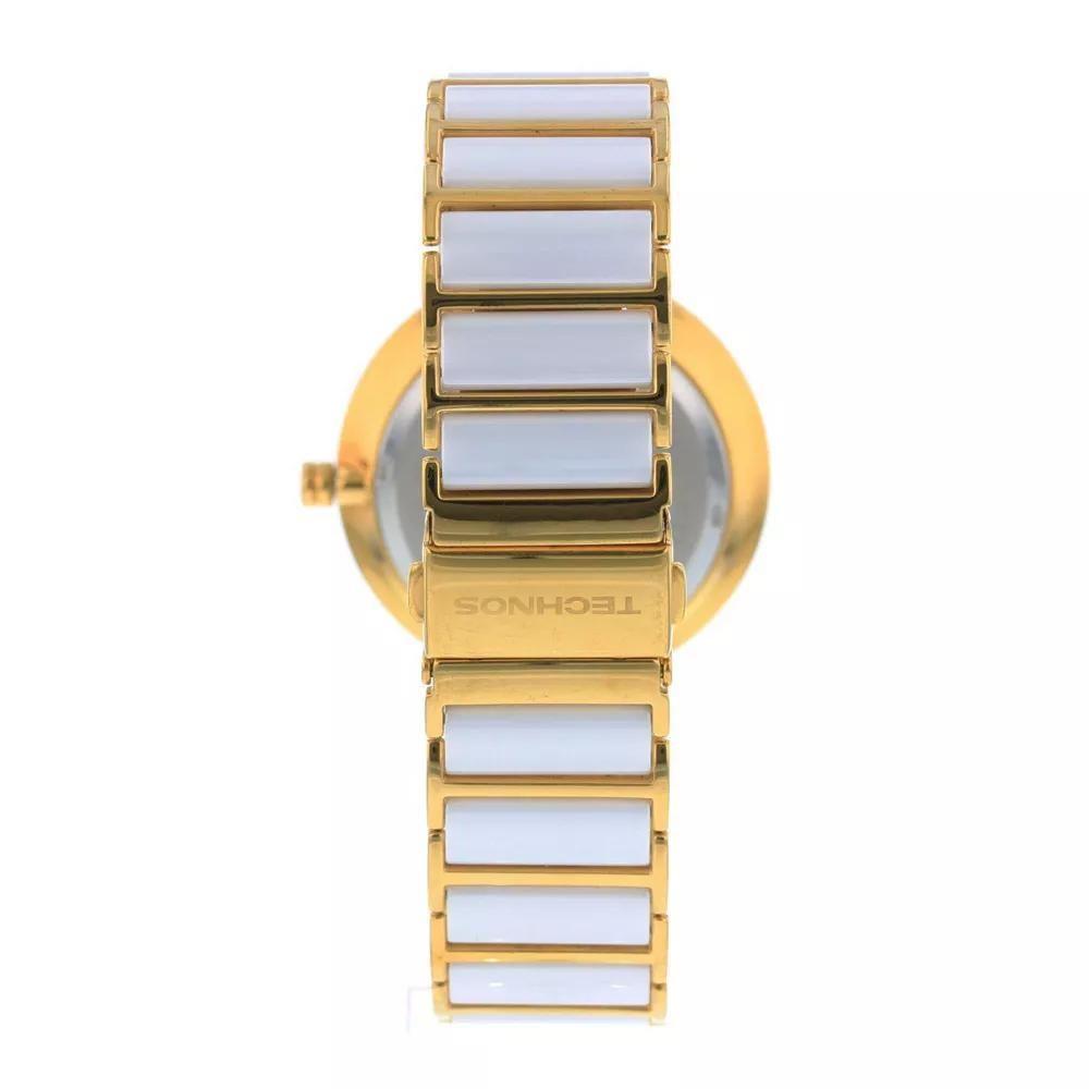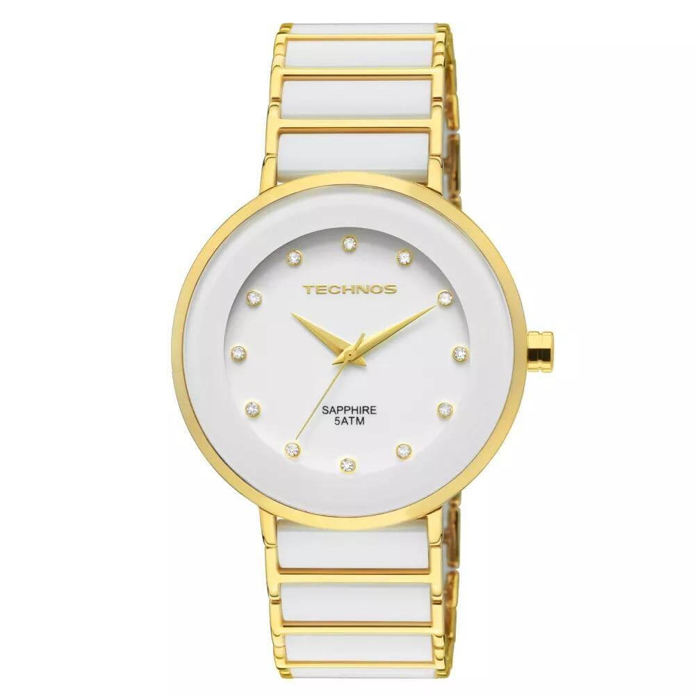 RELÓGIO TECHNOS FEMININO ANALÓGICO, COM PULSEIRA DE METAL E CERÂMICA DOURADA E BRANCA, COM MOSTRADOR DE FUNDO BRANCO COM CRISTAIS E DETALHES EM DOURADO.