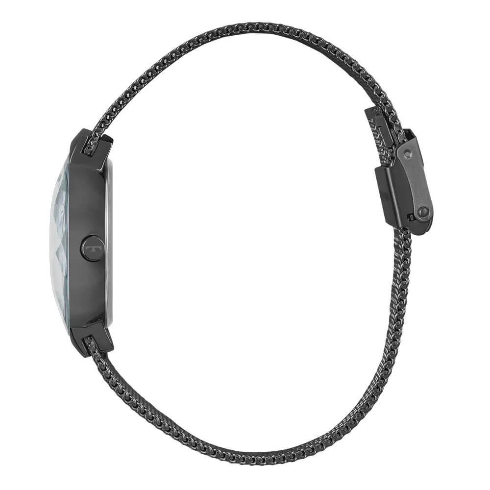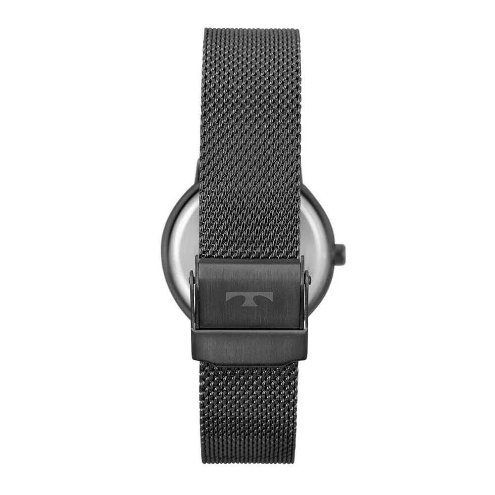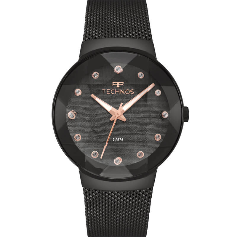 RELÓGIO TECHNOS FEMININO ANALÓGICO, COM PULSEIRA DE METAL PRETA TIPO ESTEIRA, COM MOSTRADOR TRABALHADO DE FUNDO PRETO COM CRISTAIS SWAROVSKI.