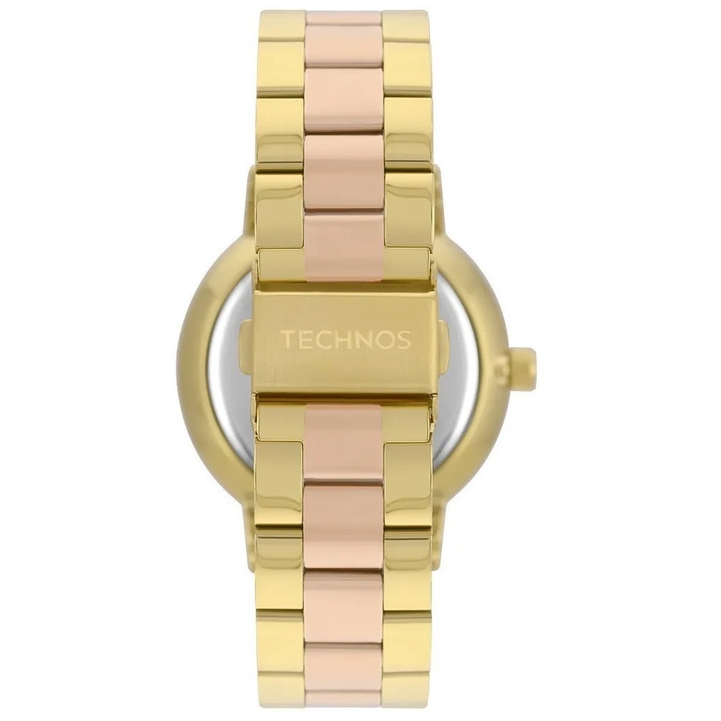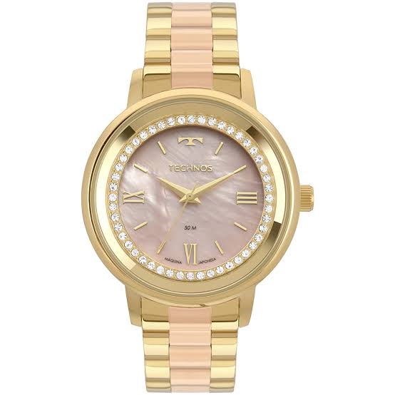 RELÓGIO TECHNOS FEMININO ANALÓGICO, COM PULSEIRA DE METAL DOURADA E ROSE, COM MOSTRADOR FUNDO ROSE MADREPÉROLA E CAIXA COM CRISTAIS INTERNO.