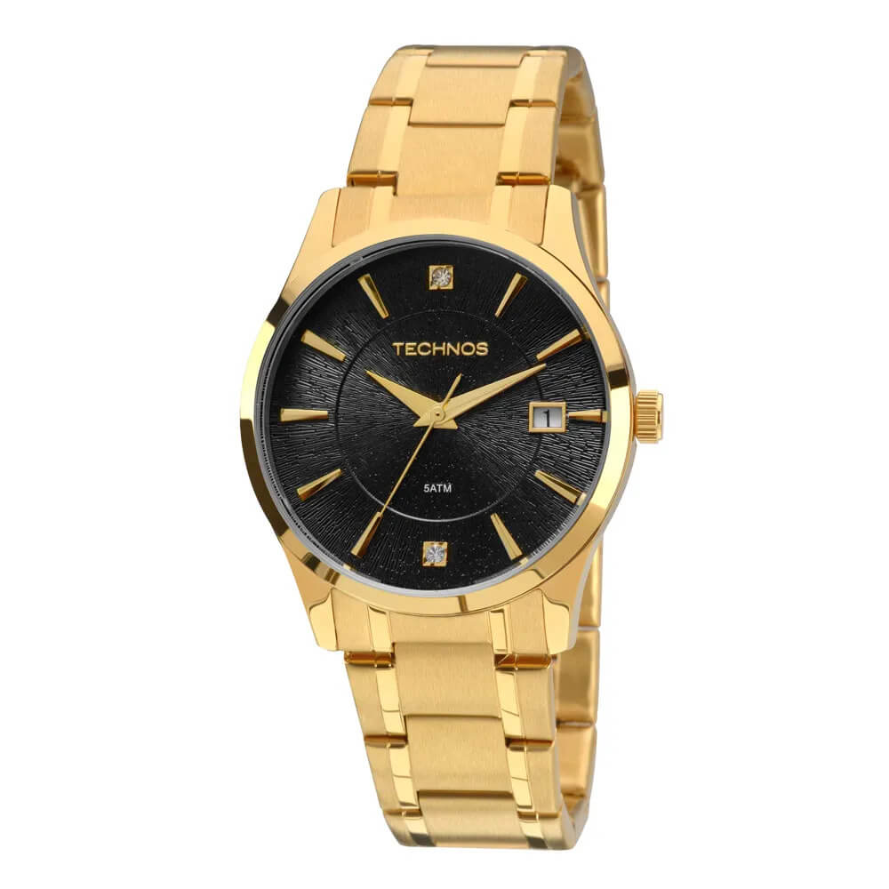 RELÓGIO TECHNOS FEMININO ANALÓGICO, COM PULSEIRA DE METAL DOURADA, COM MOSTRADOR FUNDO PRETO, COM CRISTAL DE DETALHES.